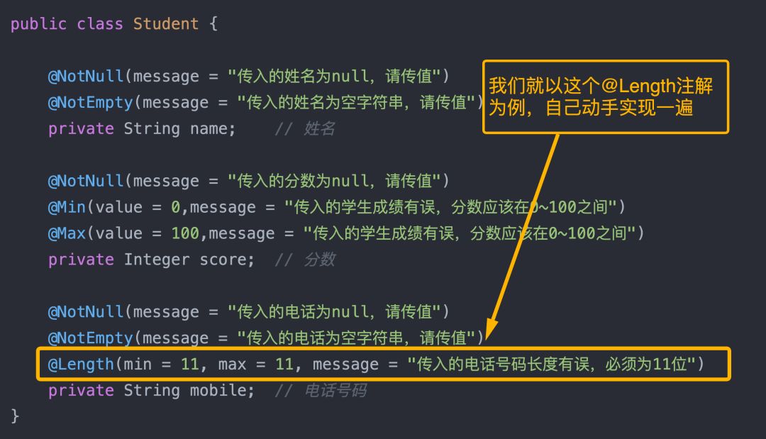 今天本文则以上文的 @Length注解为例,自己动手实现一遍,这个学会了,其他注解实现原理也是类似。