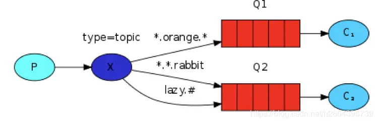 - topic:可以使来自不同源头的消息能够到达同一个队列。只要RoutingKey匹配路由表(BindingKey表)就可以转发, 使用topic交换器时,还可以使用通配符进行匹配。