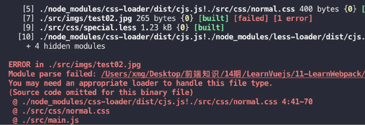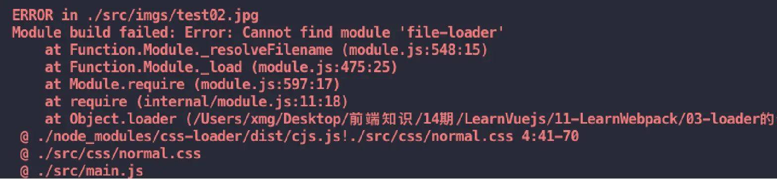 这次因为大于8kb的图片,会通过file-loader进行处理,但是我们的项目中并没有file-loader
