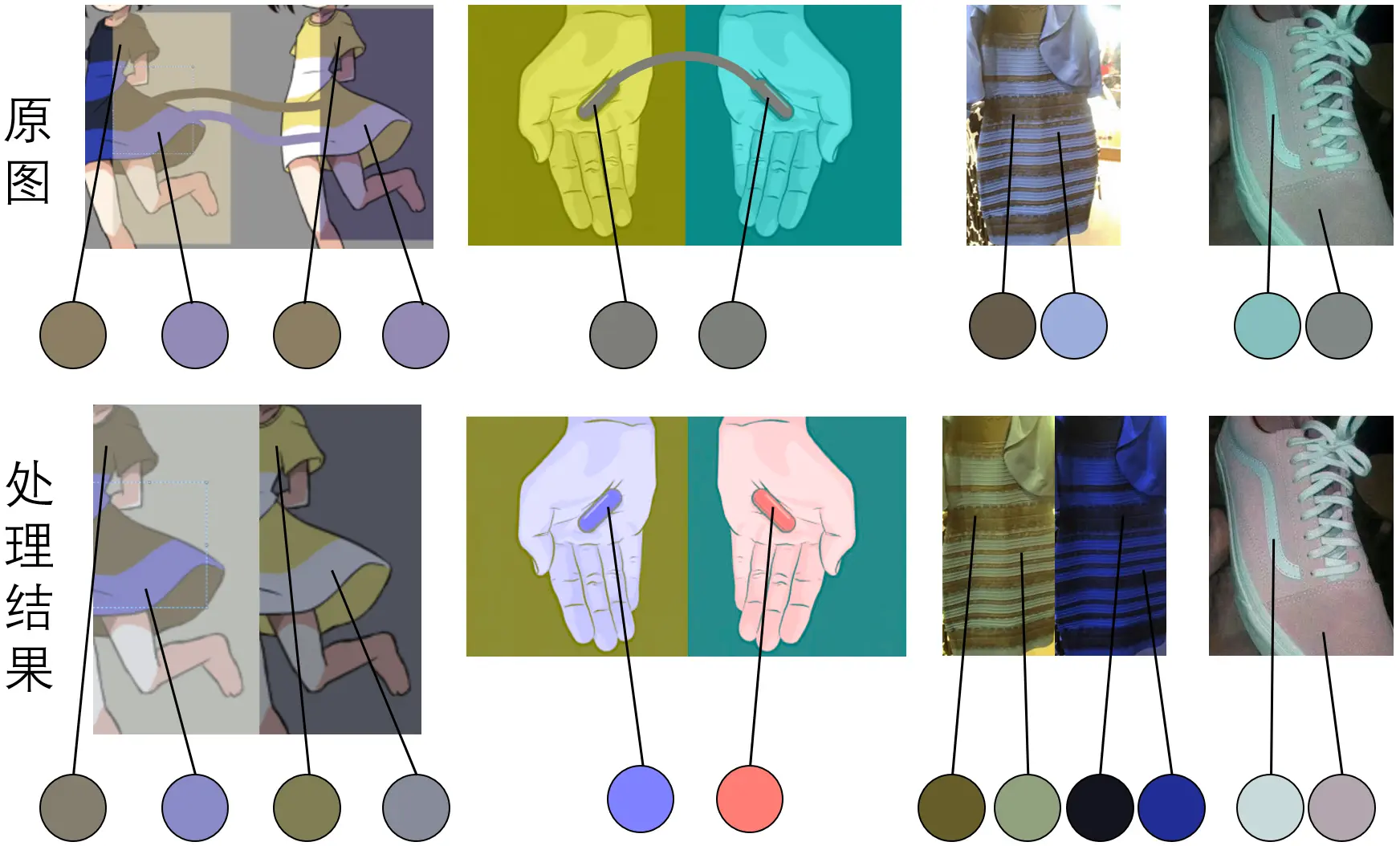 通过光源估计和消除有色光源影响,我们得到了更接近人眼色彩认知结果的图像。为了便于观察,主要颜色像素在图中进行了放大。