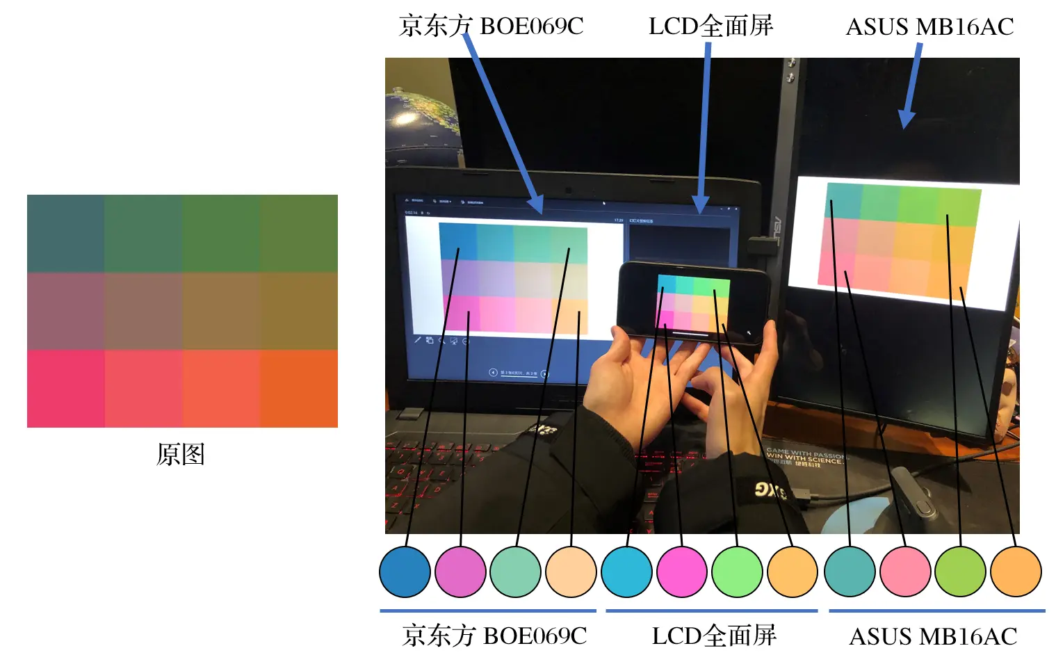 用于对比的显示器分别是华硕飞行堡垒默认配置的京东方BOE069C、IphoneXR默认配置的LCH全面屏以及华硕的移动便捷显示器MB16AC,同一张图像在三个不同的显示器上的色差是非常显著的。这是因为显示设备发光光源与显示器的色域存在差异所导致的,此外拍摄的视场角对图像颜色有一定的影响,但是与设备显示本身的色差来说是可以忽略的。