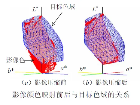 以广色域向窄色域设备的色域映射为例,色域映射所需的结果如下图所示。