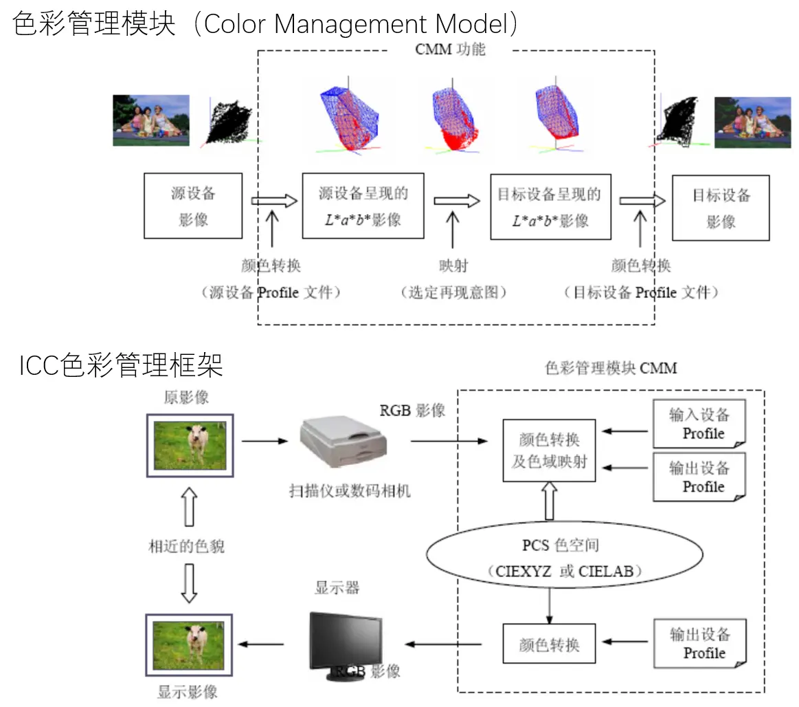 不难发现,色域映射其实就是将颜色信息转换到设备无关颜色空间中进行压缩,色彩管理也是基于同样的想法。这些问题都已有硬件、软件工程师提前替用户考虑了,色彩管理是一种大部分用户并不知道,但实际上一直存在的技术。现有成熟的色彩管理模块与色彩管理框架如下图所示。