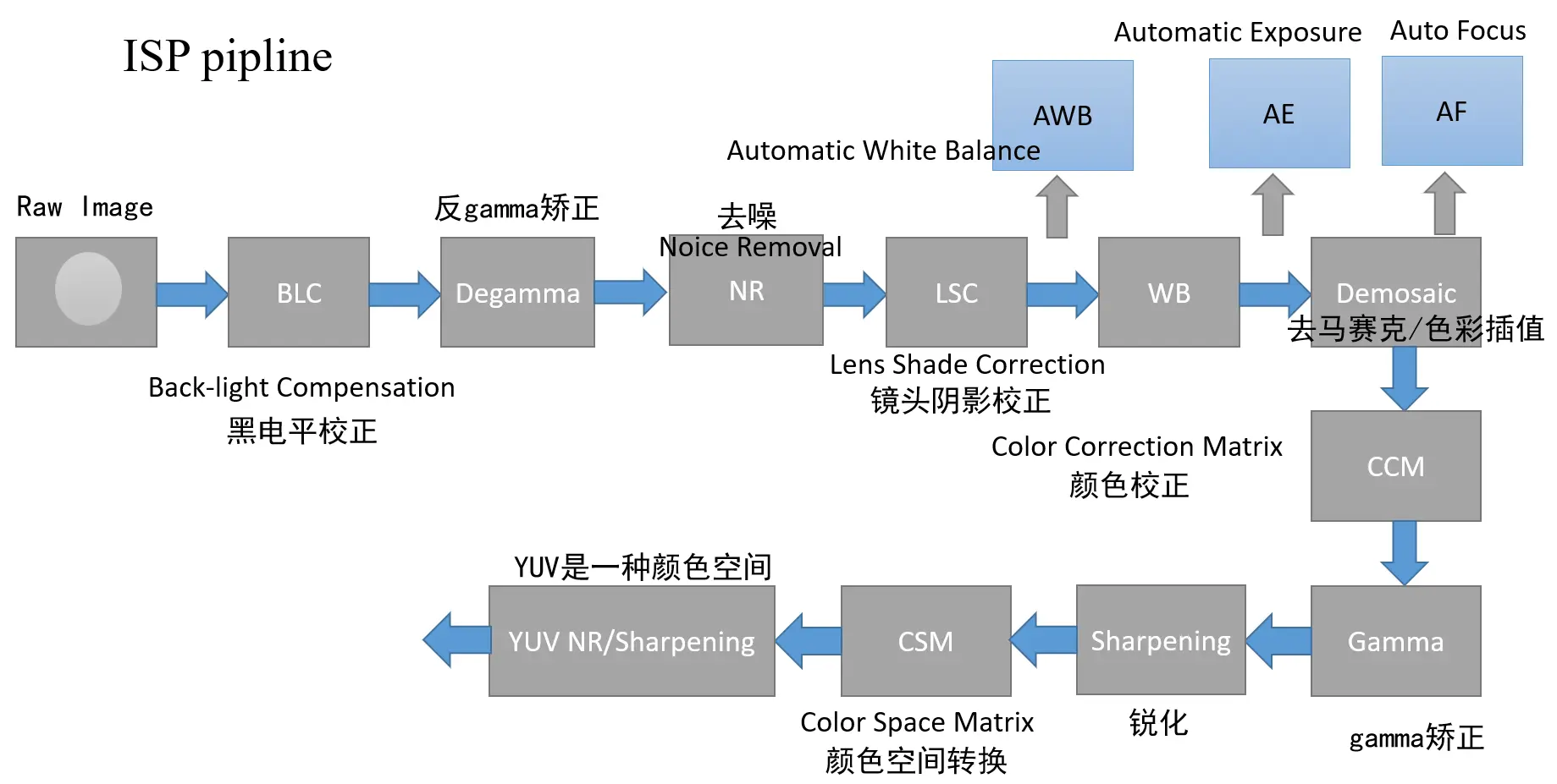 在相机成像的时候,为了使相机记录下的数字图像与人眼感知的相似,需要进行一系列的图像预处理,这一系列流程被称之为图像信号处理(Image Signal Process)。一种常见配置的ISP pipieline如下图所示。