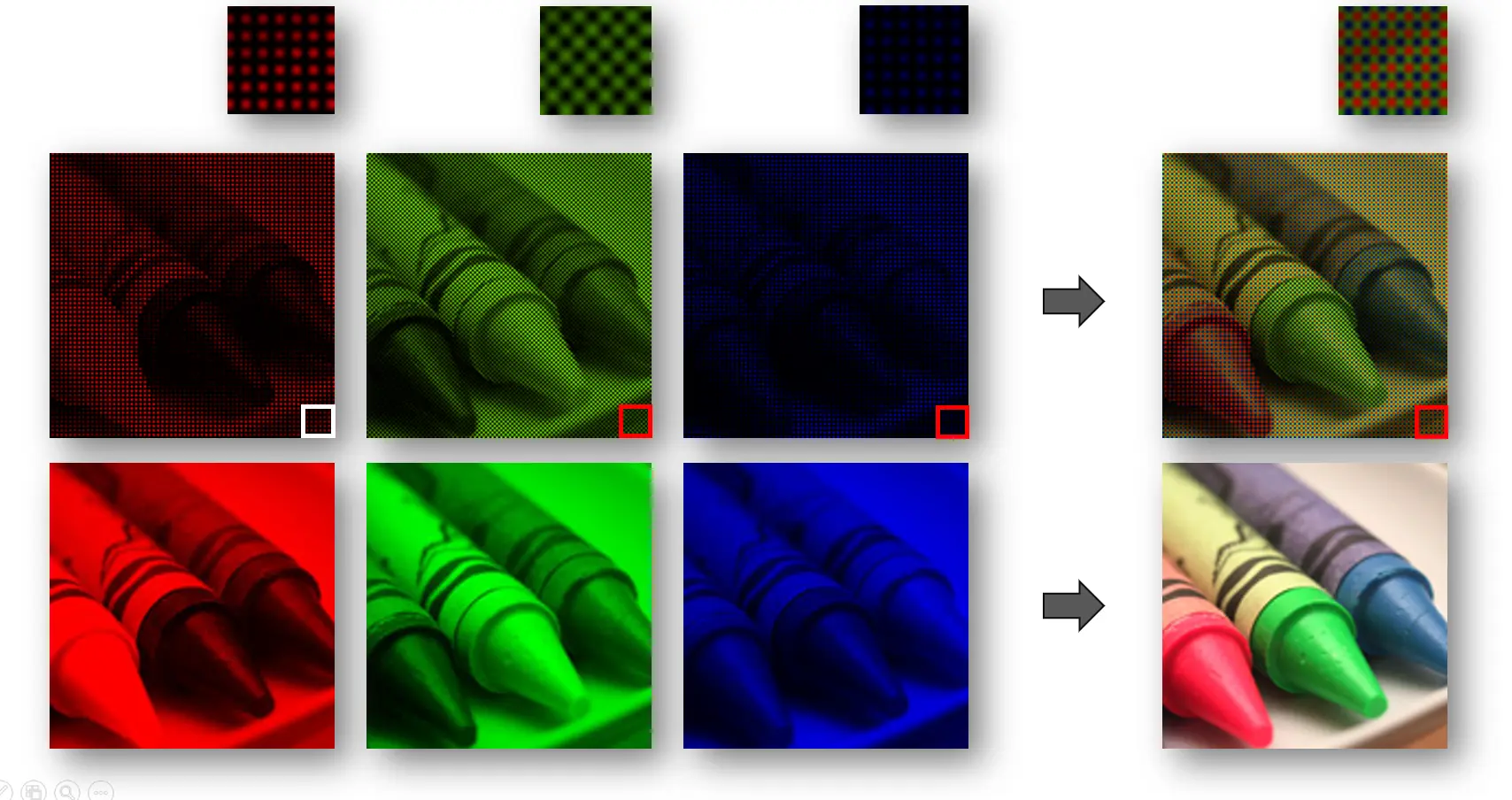 其中,绿色的滤光片占了50%的比例,而红、蓝分别占了25%。这么做的原因其实同样与人眼视觉特性相关。通常情况下,人眼对绿色更加敏感,因此彩色滤镜阵列中的绿色滤镜会占更多的比例。最终获得的RAW图像需要经过插值才能得到最终我们所看到的彩色图像,如下图所示。