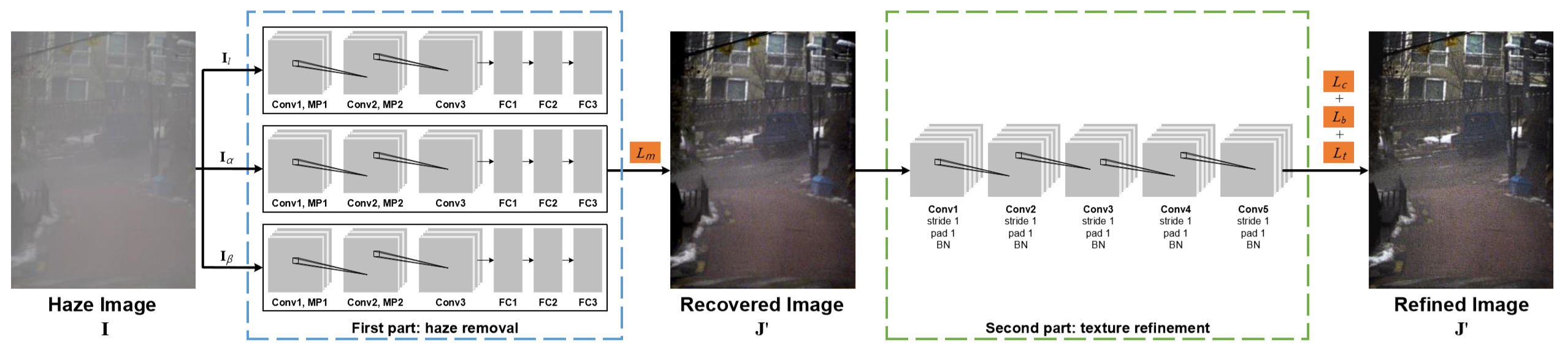 分为整个网络分为两个部分:haze removal part(蓝框部分)负责去雾;texture refinement part(绿框部分)负责纹理增强。