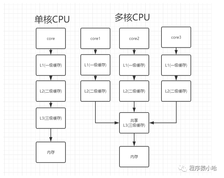 众所周知,CPU 是有单核和多核之分.在单核 CPU 的时候,只需要一套 L1,L2,L3 缓存.但是当多核时,每个核心都必须有自己的一套 L1(甚至 L2)缓存,而共享 L3(或 L2)缓存.