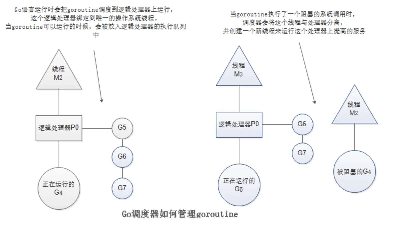 调度器使用的 G-M-P 模型。下面是相关的概念: