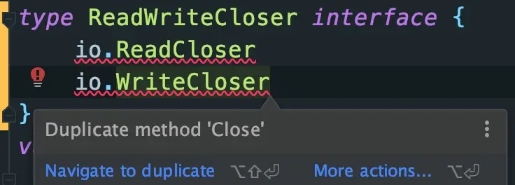 Go 1.14 现在允许嵌入具有重叠方法集的接口:来自嵌入式接口的方法允许与 (嵌入) 接口中已存在的方法拥有相同的名称和签名。