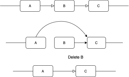假如过了一段时间,B又回到了原处,我们不需要D了,要删除这个节点该怎么办?很简单,直接让D将B的最新的联络方式给A就可以了。也就是说让A跨过D指向B即可。