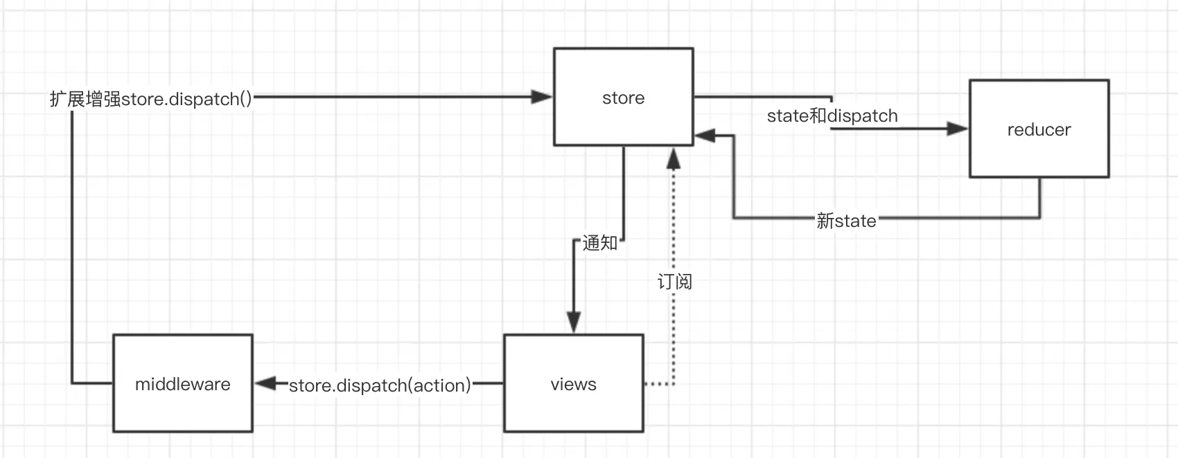然后我们再把plan换成reducer,把changeState换成dispatch就会发现,这就是Redux源码所实现的基础功能,现在再回过头看Redux的数据流图是不是更加清晰了。