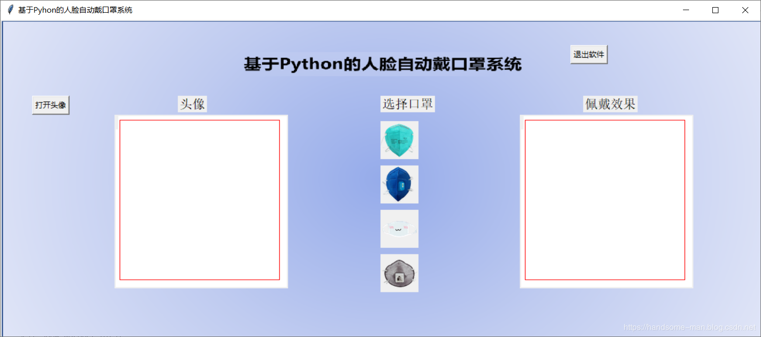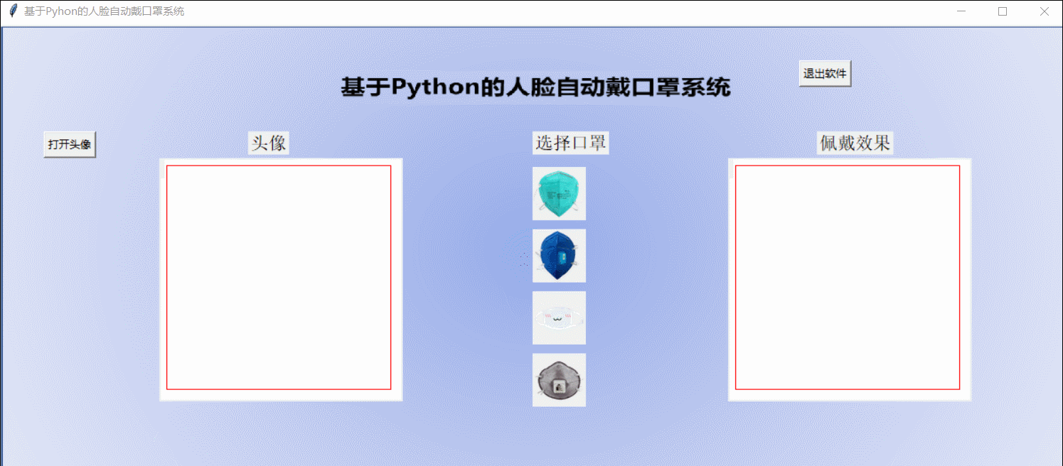 基于tkinter模块实现GUI设计,可载入人物图像,选择四种类型口罩(这里的口罩是处理好的图片),展示佩戴好口罩的效果,操作完成退出系统,效果如下所示: