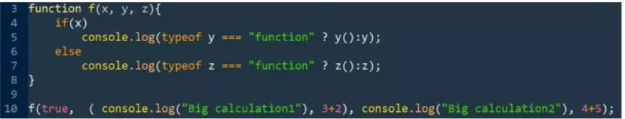 我们可以看出,虽然传入的第一个参数为true,导致函数f内部只会打印第二个参数y代表的表达式的值,5,但是第三个参数代表的表达式在函数f调用时,也进行了表达式求值,所以最后console也输出了Big calculation2。 如果我们想实现所谓的“惰性求值”,有时候也称”惰性计算“,那么只需要将原本写在表达式位置的逻辑用一个JavaScript函数包裹起来,如下: