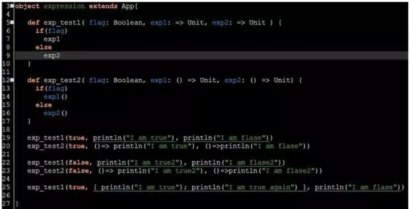 可以看到,即使传入两个函数exp_test1和exp_test2的第二个和第三个参数都是表达式,Scala也能做到对表达式的惰性求值: 第19行和第20行的函数调用,第三个参数位置的表达式和函数都没有即时求值,而是惰性求值。 第22行和第23行的函数调用,第二个参数位置的表达式和函数都没有即时求值,而是惰性求值。