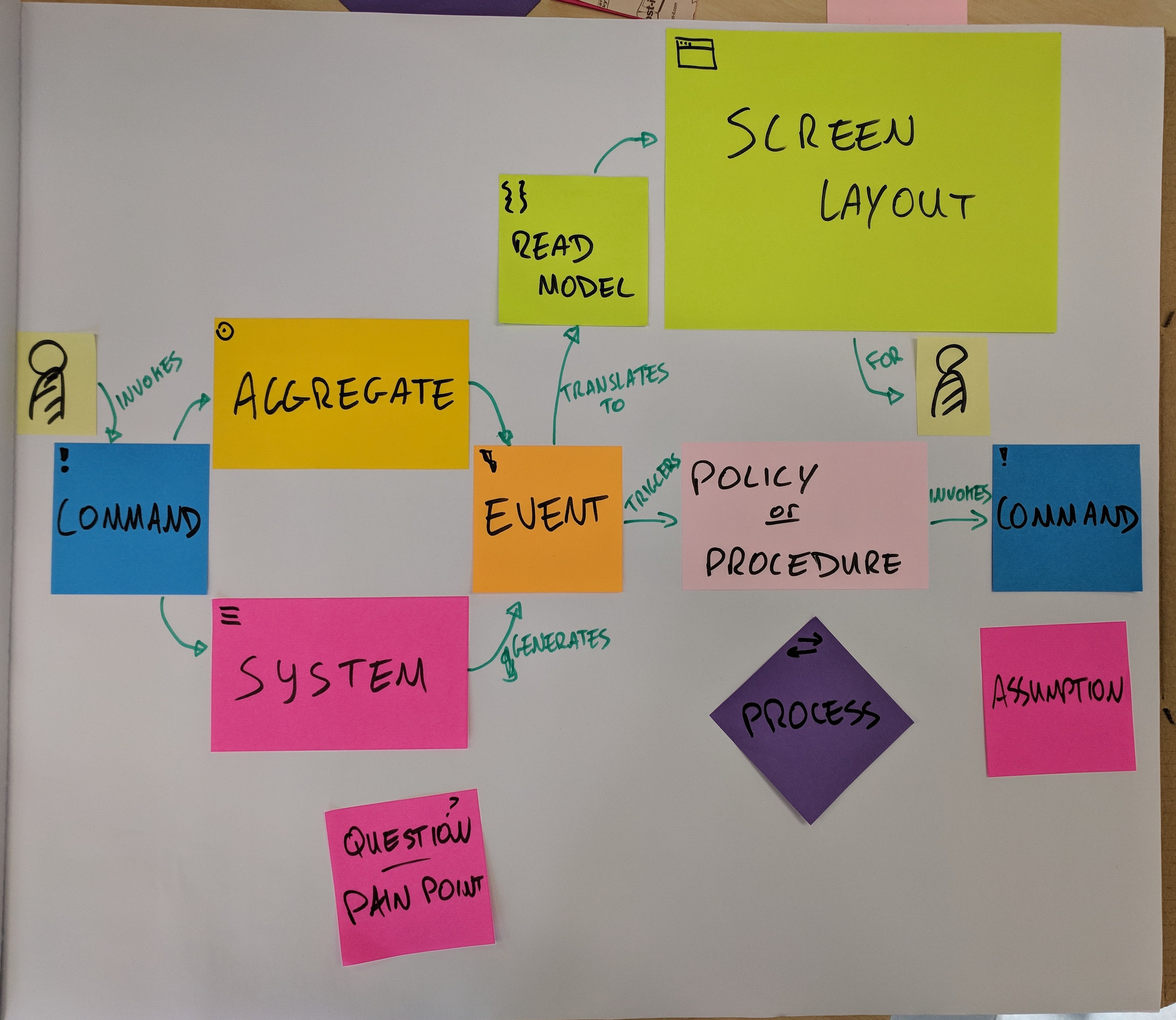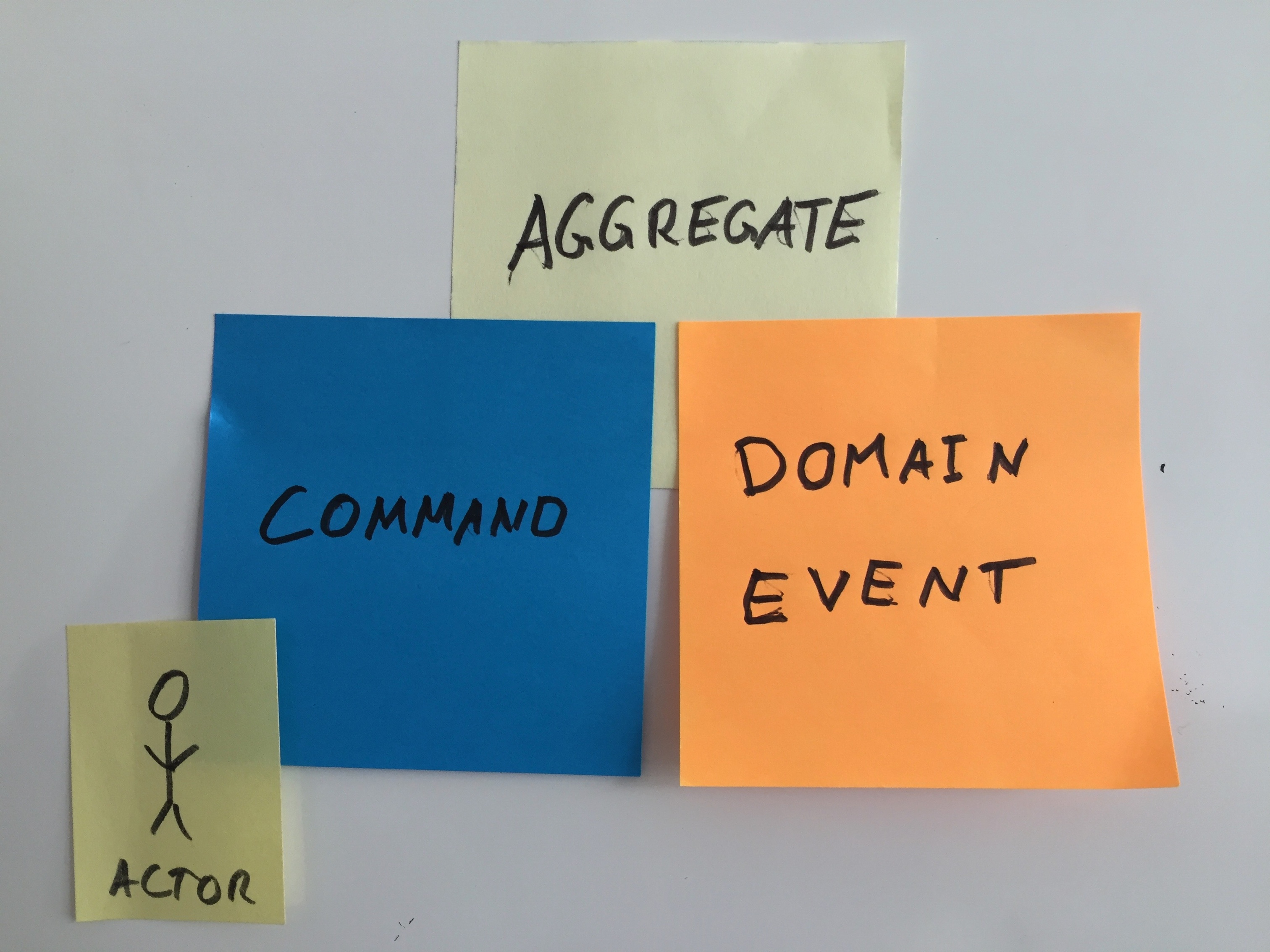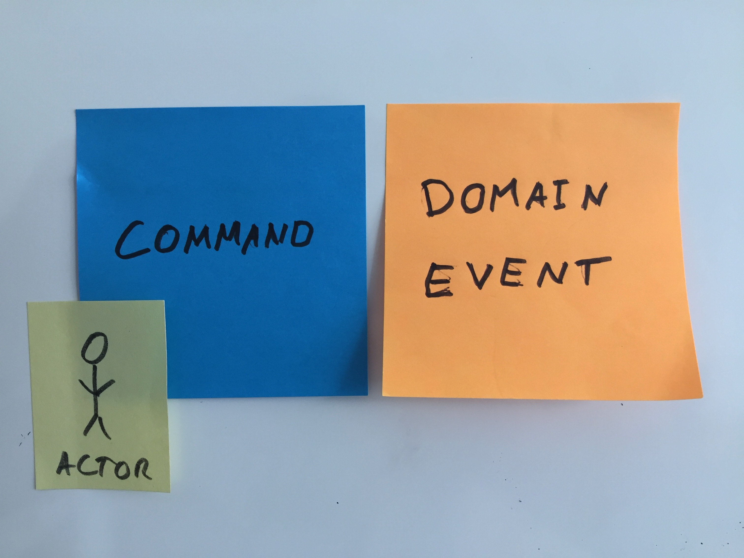 命令(Command): 既然有了事件必然有产生事件的对象,这就是命令。命令可以理解为是一个动作,执行了动作之后就会产生相应的事件。典型的动作描述可以是: 「取消订单」,「结账」等。使用深蓝色的即时贴表示。