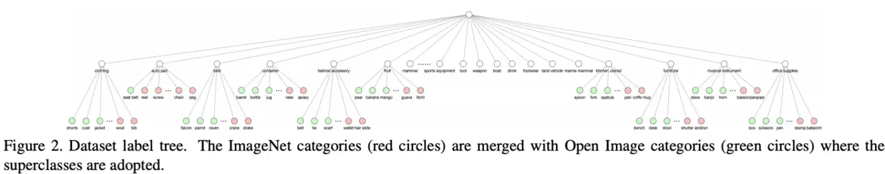 新训练集基于ImageNet(选了531类)和Open Images dataset V4(选了469类),但训练集间的类别不同,为了防止合并后存在漏标的情况,先对label进行分析和合并成树状结构,补充标注,然后去掉标注质量差的图片,包括包含目标太小()的图片。将类别分为训练集和测试集,先用COCO的类别作为基础训练集,防止pretrain的影响,然后尽量选择与当前训练集差距较大的类别作为测试集,共包含200类,再选择另外800类作为训练集