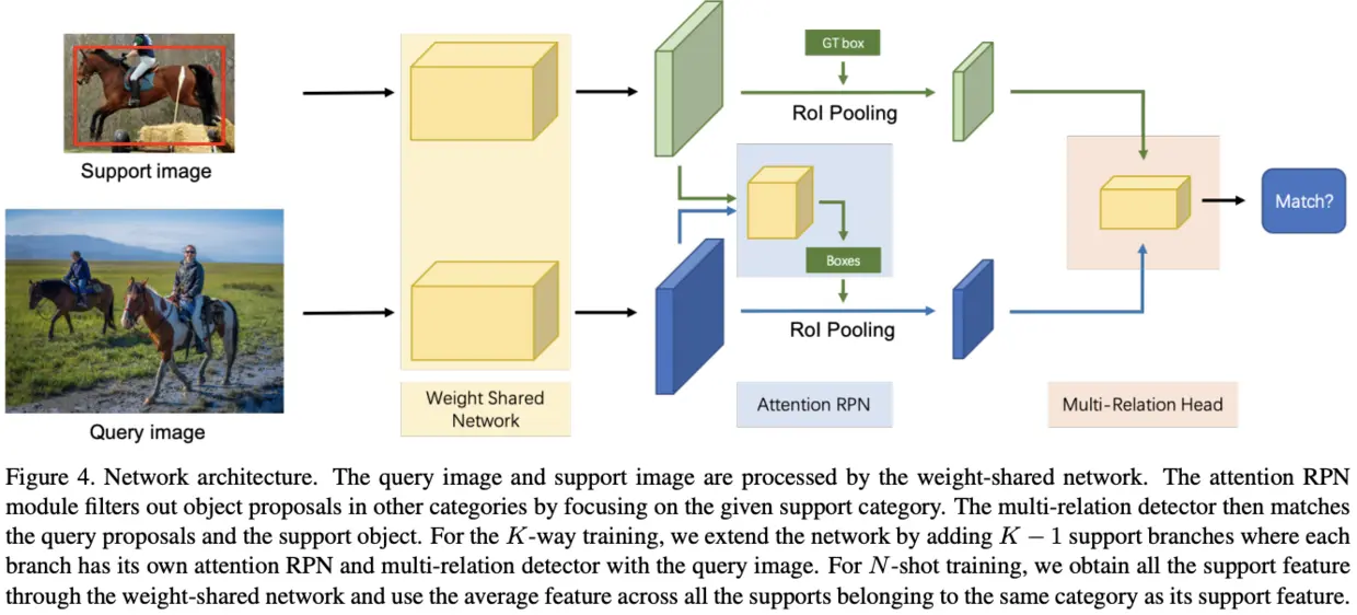 论文提出新attention网络,该网络能够在RPN模块和多关系检测模块中学习辅助集与查询集间的通用的匹配关系。网络为包含多分支的权重共享框架,一个分支用于查询集,其它则用于辅助集(为了方便,图4只画了一个分支),对于同类别的辅助分支,使用平均特征图作为辅助特征图。查询分支的权重共享主干为Faster R-CNN(包括RPN),使用这个分支来训练辅助集和查询集的匹配关系,能够学习到同类别的通用知识