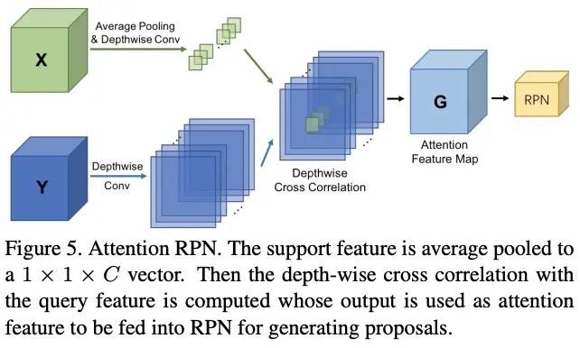 在少样本目标检测中,RPN能够产生潜在的相关box用于接下来的检测任务,不仅要分辨前景和背景,还要过滤不属于辅助集的前景。如果没有足够的辅助集信息,RPN将会产生大量不相关的proposal。为了解决这个问题,提出了attention RPN,能够使用辅助图片的信息来过滤背景以及不相关的前景,产生更少但更准的候选目标