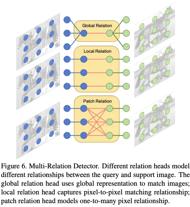 RPN后面一般会接一个检测器用于对proposal进行重新评估和调整,而论文则希望检测器能够有强大的类别区分能力,提出了多关系检测器(multi-relation detector)来度量相似性.该检测器包含3个attention相似性模块,将3个模块的分数求和作为最终的匹配分数。对于大小均为的辅助特征