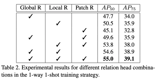 论文对不同的训练策略进行了对比,2-way 5-shot对比训练策略效果最优,并且可以看到attention RPN也是有效的,提升了1.9