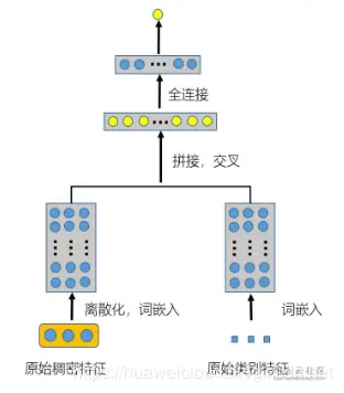 1. 如图 1 所示,把原始的稠密特征直接和全连接层进行连接不和通过词嵌入转化的类别稠密特征进行交叉: