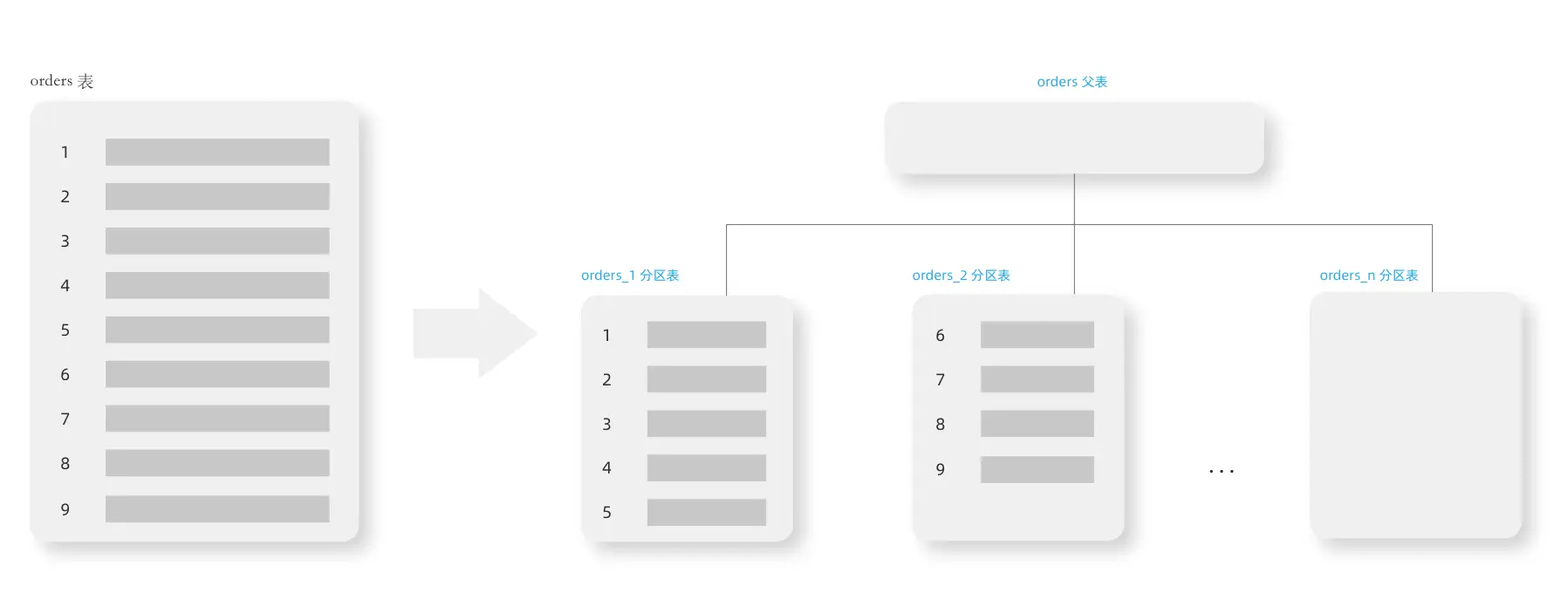 如下图,分区表就是根据分区策略,将数据数据分散到不同的子表中,并通过父表建立关联关系,从而实现数据物理上的分区。