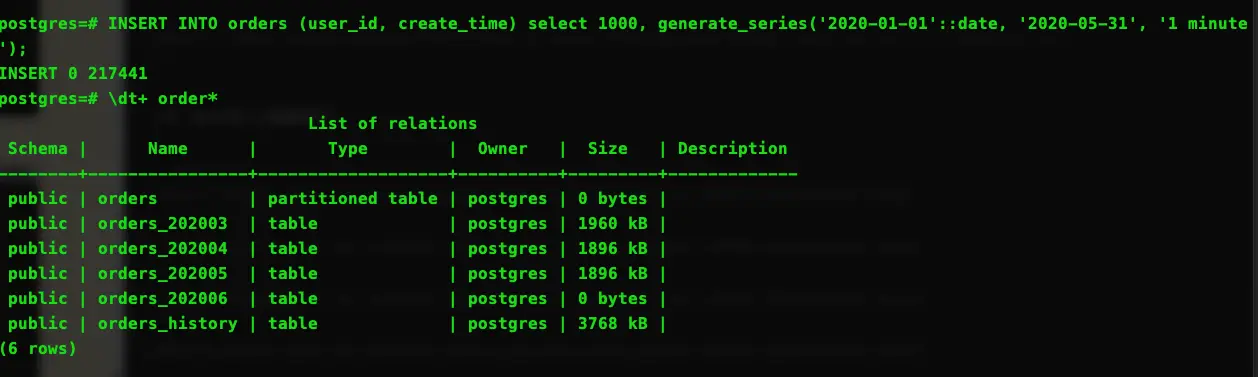 通过以上步骤 order 的分区表就创建完成。我们通过 \dt+ orders* 来查看创建好的主表和分区表。