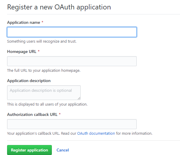 当别人评论你的文章时,会需要它是授权。点击注册 OAuth Application进行注册,注册界面如下: