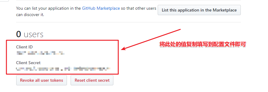 点击 Register application(注册)会出现 Client ID/Secret,接下来就是将信息填入配置文件中。