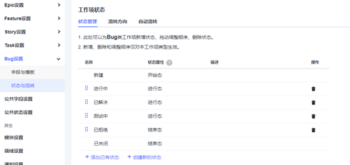 1. 确定缺陷状态,例如新建、进行中、已解决、测试中、已拒绝、已关闭,DevCloud缺陷工作项模板已经预置了上述状态,也可以自己扩展添加新状态