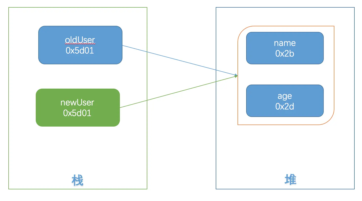 实际上仍然不是引用传递,引用传递我们学习 C++ 的时候经常会用到,就是指针。而这里传递的其实是一个副本,副本中只存了指向堆空间对象实体的地址而已。我们我们修改参数 newUser 的属性间接的就是修改了原变量的属性。
