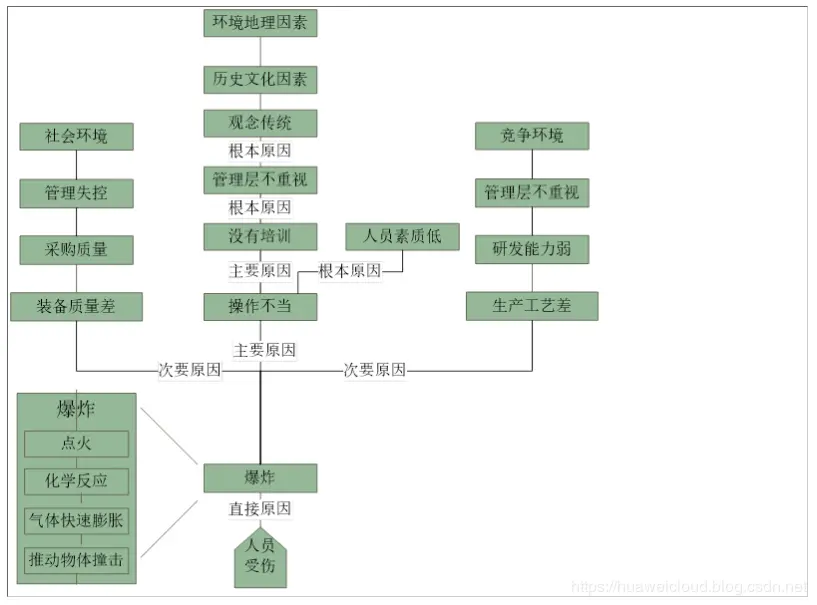2. 原因可以有很多分支,如爆炸直接原因就有三类,装备质量差,操作不当,生产工艺差。