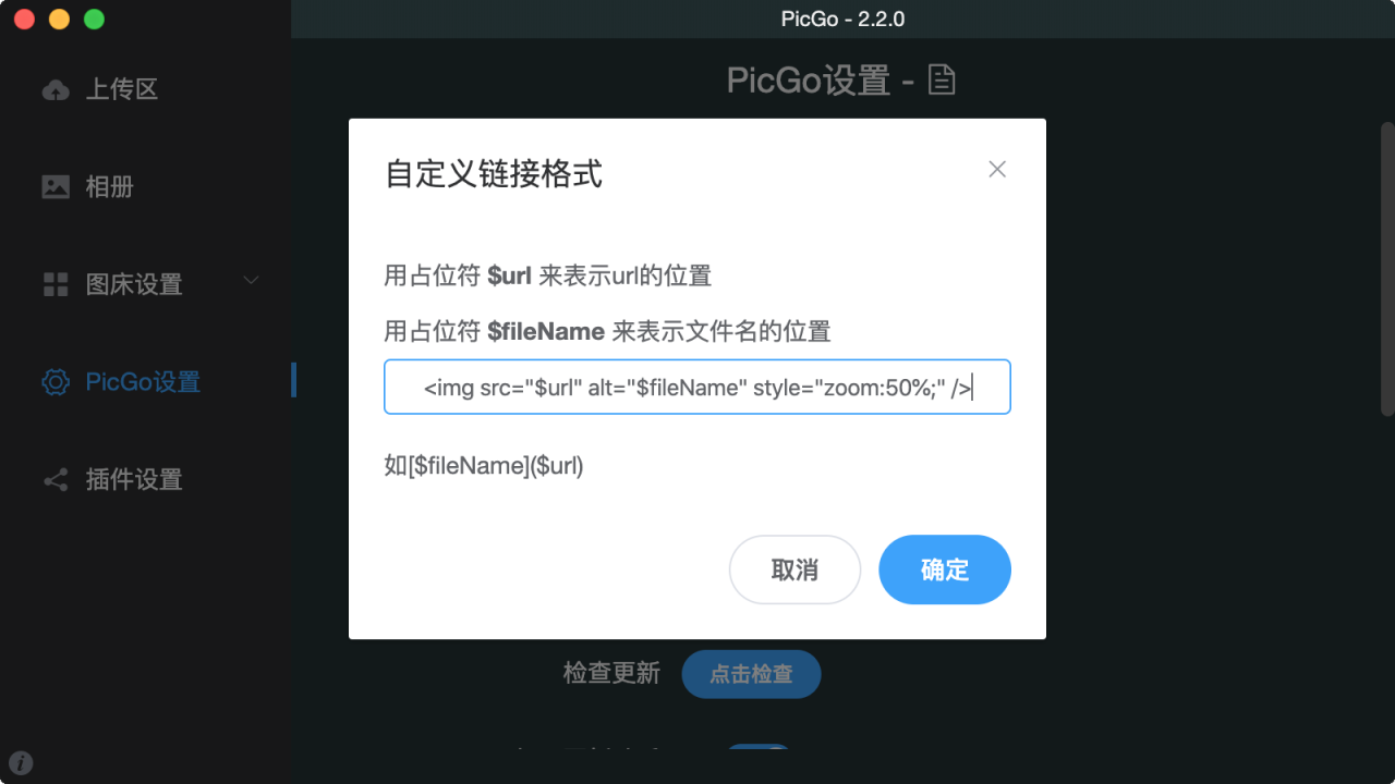 通过自定义链接格式,可以直接生成符合需要的Markdown代码,方便粘贴。如我喜欢通过OSS将原始图片等比缩放到宽度<=1280px,并将图片缩放50%来优化显示效果及速度,配置如下: