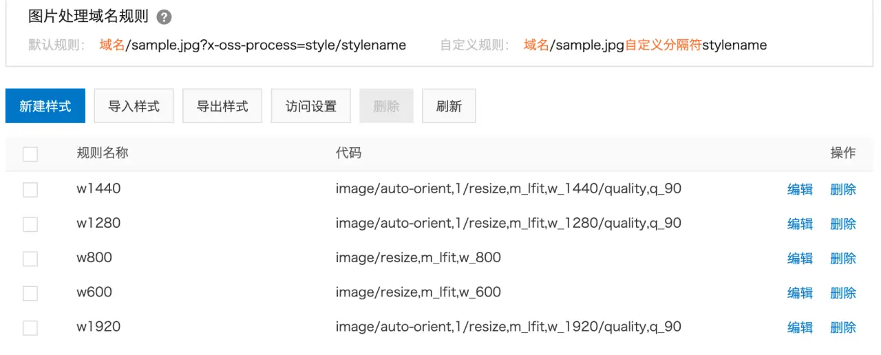 网址后缀:这是阿里云OSS的一个很好用的功能,用于图片处理(如缩略图)。需要去OSS的 图片处理规则 中创建样式。以下是我设置的规则,后缀