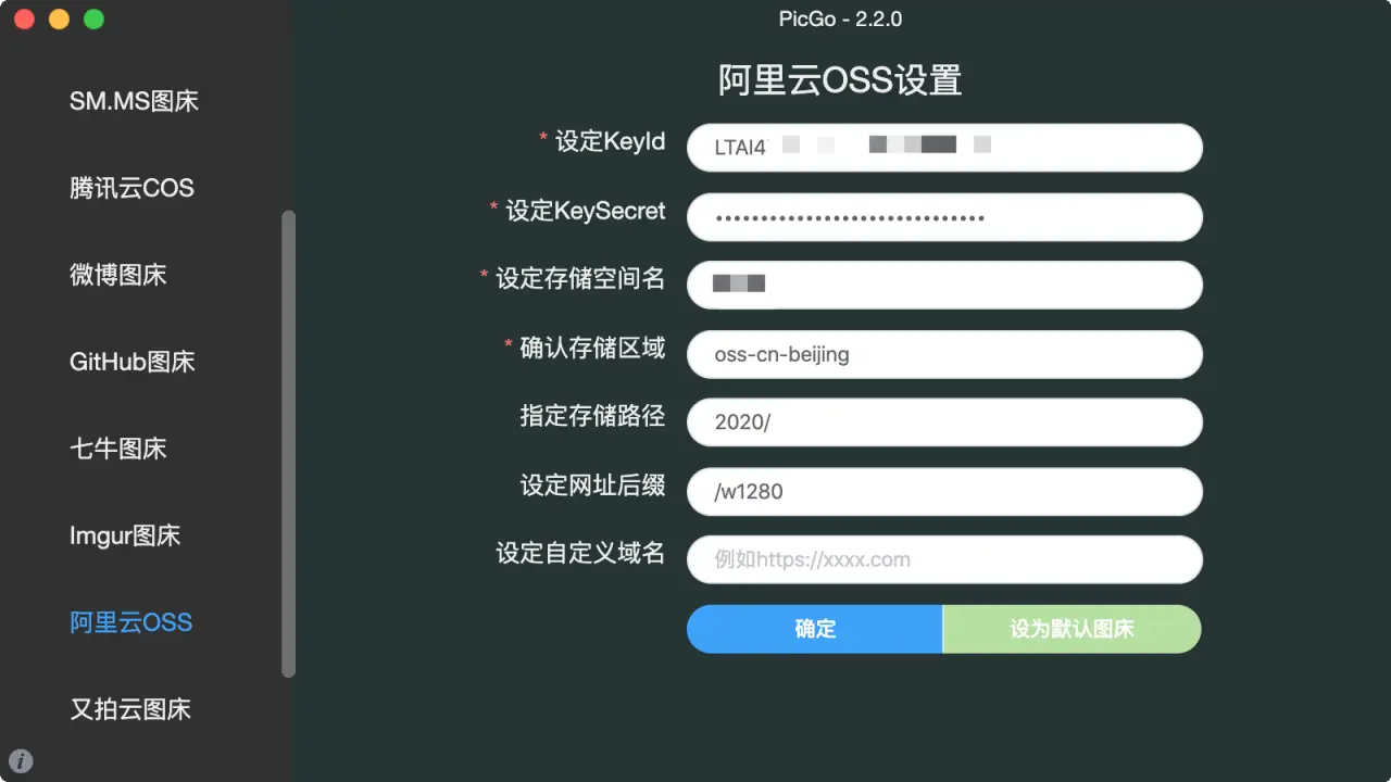 阿里云OSS图床配置如上图,参数说明: