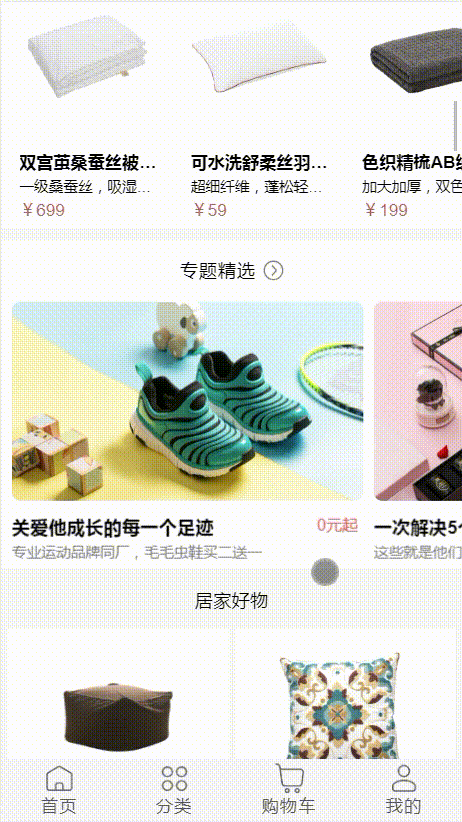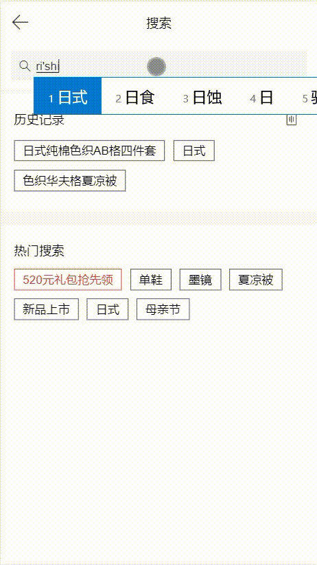 这里将vant的search组件作为当前路由的子组件,热门搜索,历史搜索点击可直接搜索相关商品,也可输入关键词搜索,输入时有相关关键词索引,点击可进行搜索。