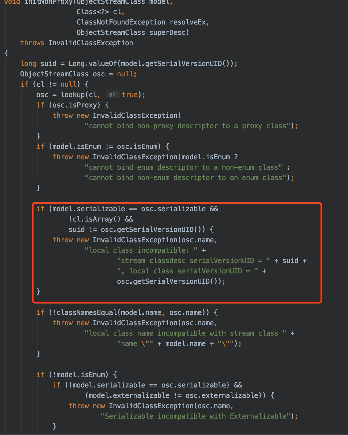 在反序列化过程中,对serialVersionUID做了严格比较,如果发现不相等,则直接抛出异常