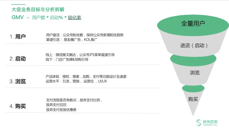 从数据的角度,我们先对促销活动进行业务目标的分析拆解。大促的终极目标是销售额,销售额受用户数、启动比例、转化率的影响。品牌商决定了活动产品、产品定价之后,可以通过运营来影响参与用户数、是否愿意购买、用户购买多少等指标。