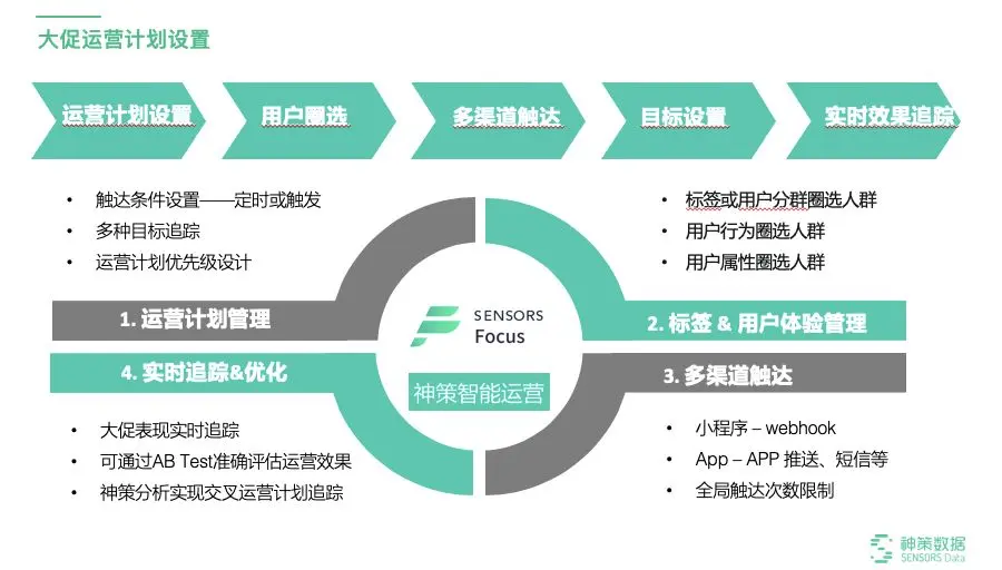 另外,要从单一、简单的运营方式,渐进到复杂的运营方式。比如,在神策智能运营中,可以围绕用户全生命周期进行干预,对所处不同阶段的用户进行不同方式的触达。