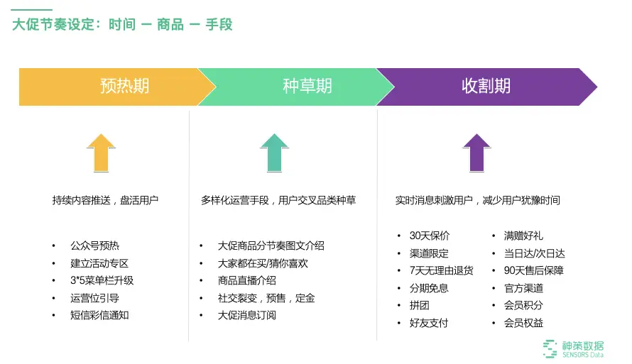 大促节奏设定的主要关键点是:时间节奏安排,大促商品选品与定价,大促收割期运营计划。