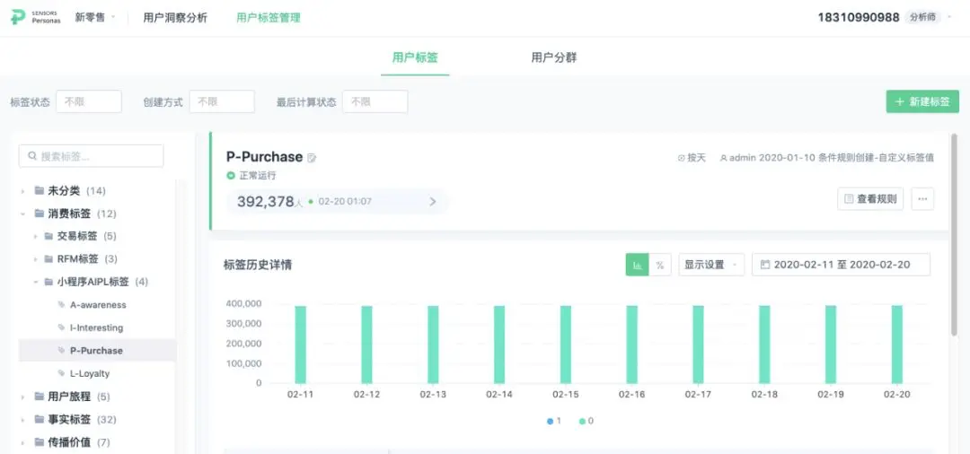 下面以 Purchase 用户交叉品类促复购为例。在神策标签画像系统中,可以设置 AIPL 标签,筛选出符合条件的 AIPL 人群,并能够实时监控。