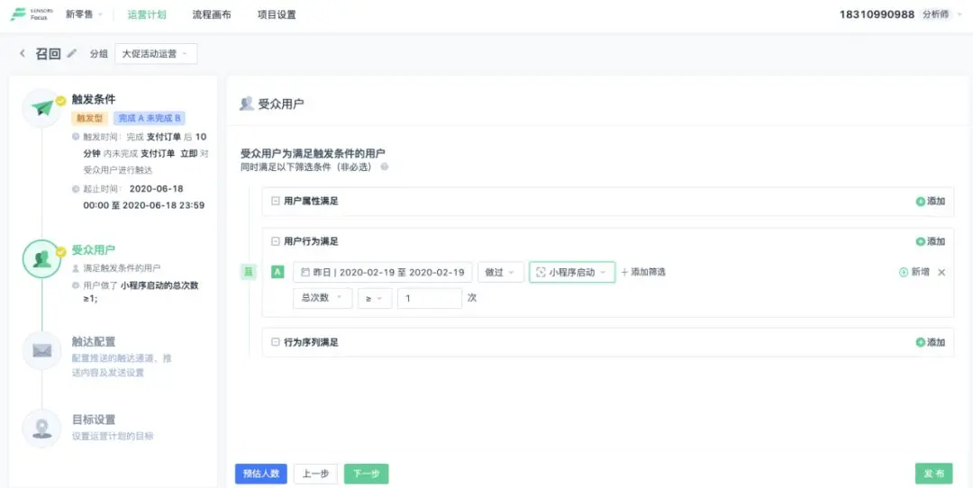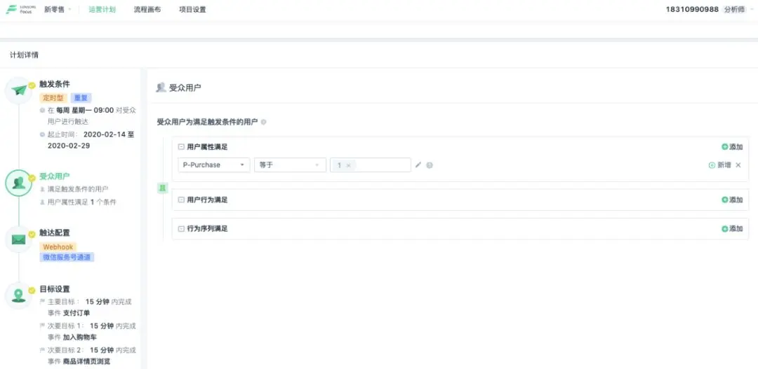 对 Purchase 用户的圈选,为后续的用户运营提供了基础,在神策智能运营系统中,通过触发条件-受众用户-触达配置-目标设置,进行“ Purchase 用户交叉品类促复购”运营计划的安排与部署。