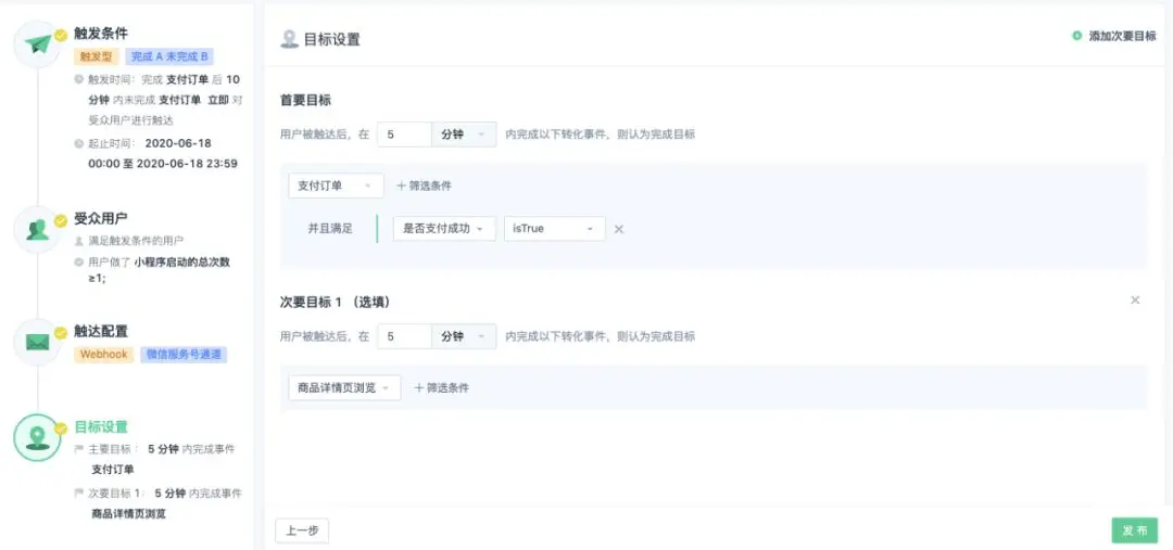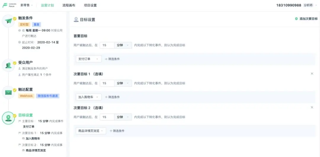 【目标设置】中,选择“首要目标”当用户被触达 15 分钟后,支付订单;选择“次要目标 1 ” 为当用户被触达 15 分钟后,加入购物车;选择“次要目标 2 ” 为当用户被触达 15 分钟后,进行商品浏览。