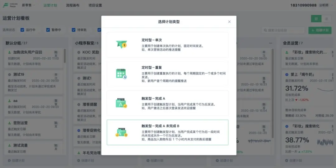 在神策智能运营的界面,我们可以看到各种的运营计划,下面围绕大促活动期间 Purchase 用户交叉品类促复购、对未付款用户进行召回的常见场景,以及大促活动结束后,对活动效果的持续追踪的常见场景进行介绍。