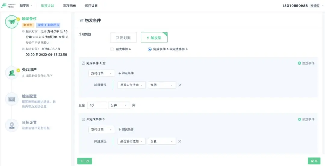 有一种常见的场景,活动当天,运营人员可能发现有一些用户在点击支付后,最终并未完成付款。若及时对这部分人进行召回,那么被挽救回来的可能性非常大。在神策智能运营中可以进行如下操作: