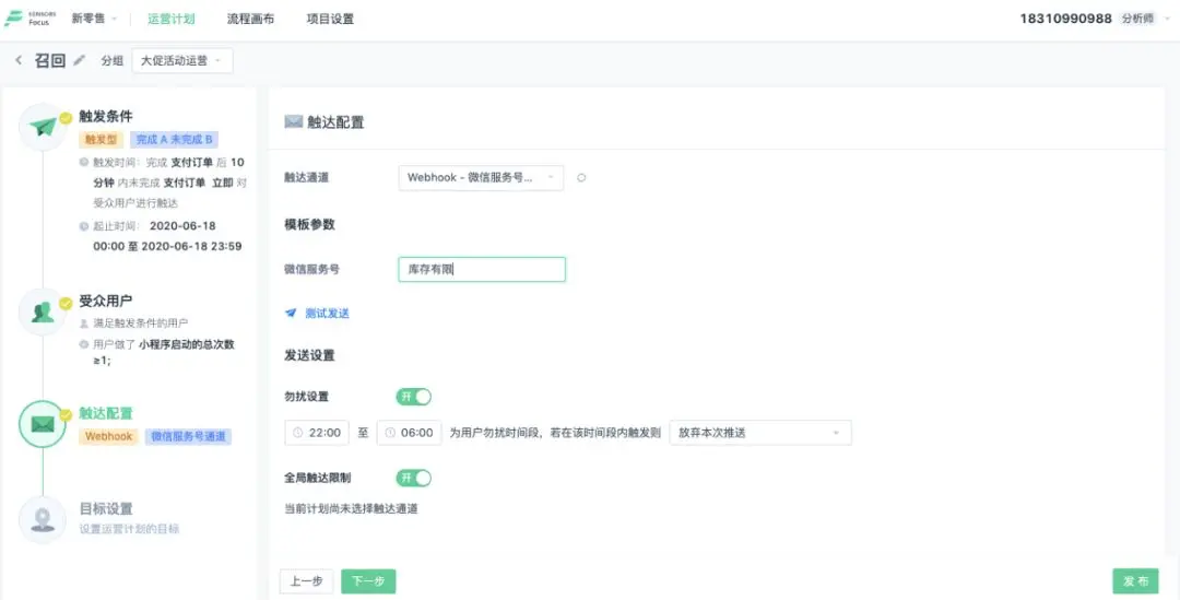 【触发条件】可以选择在一定时间下的单次触发。【受众用户】可以直接选择“ p-purchase ”。【触达配置】选择触达通道“ Webhook - 微信服务号通道”,模板参数是“那些你没用过的口碑产品”,并设置全局触达限制。
