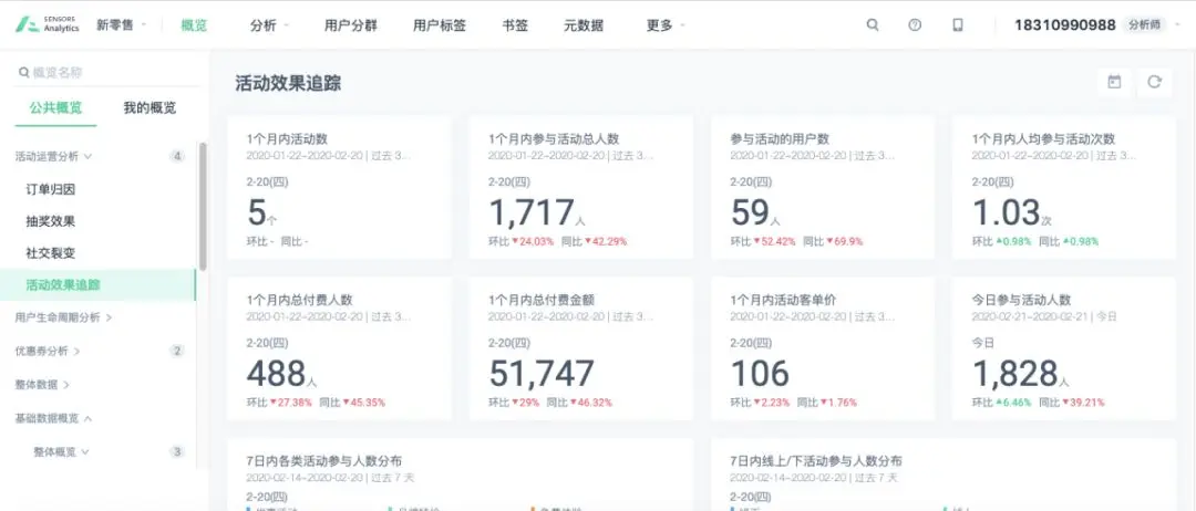 以上大促期间运营人员要做的事情,在活动结束后,运营人员还需要活动效果保持密切的追踪。比如六月份进行六一儿童节、618 两次运营活动,运营人员可通过神策分析公共概览了解当月的所有活动的全貌,如参加活动的总人数、不同的品牌产生的金额分布等,这是在活动结束后的效果复盘。