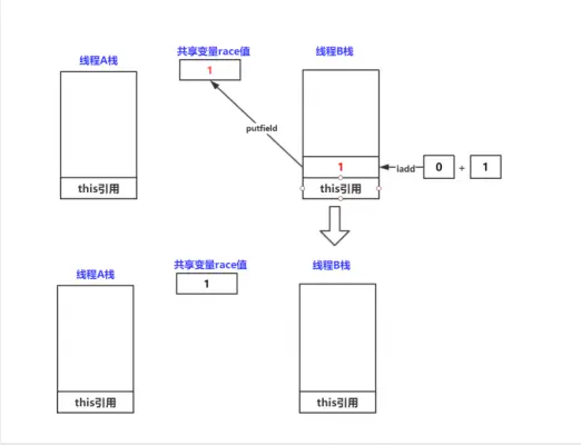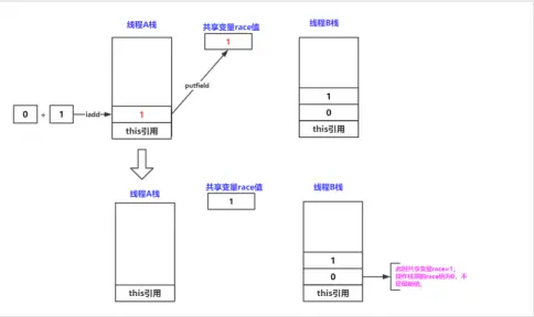 (3)线程A依次执行完了后续操作iadd和putfield,此时主内存中race的值已被增大1。线程A执行完毕后,线程B操作栈顶的race值就变成了过期的数据。