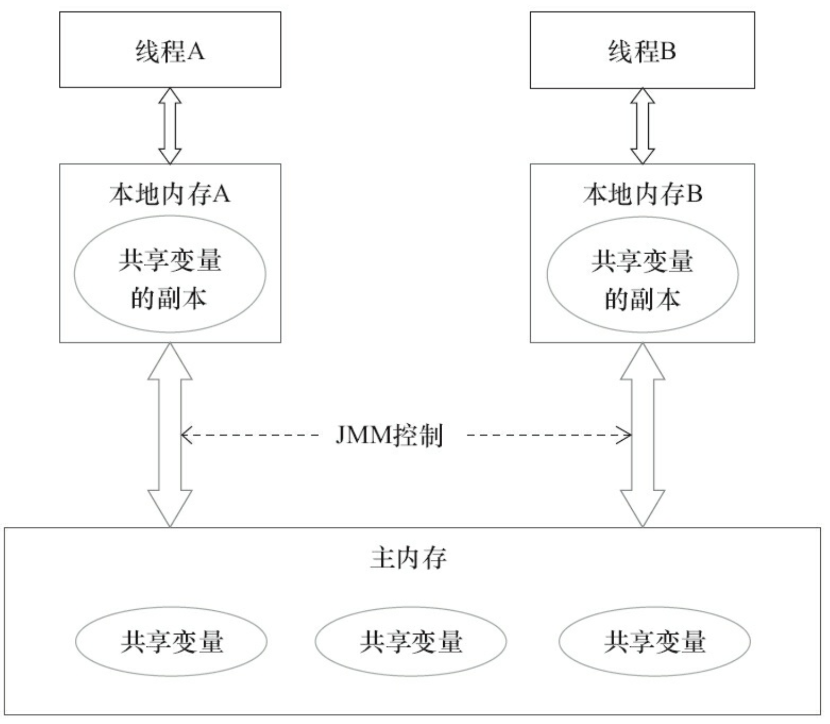 Java线程之间的通信由JMM控制,JMM决定一个线程对共享变量的写入何时对另一个线程可见。从抽象的角度来看,JMM定义了线程和主内存之间的抽象关系:线程之间的共享变量存储在主内存(Main Memory)中,每个线程都有一个私有的本地 内存(Local Memory),本地内存中存储了该线程以读/写共享变量的副本。本地内存是JMM的 一个抽象概念,并不真实存在。 Java内存模型的抽象示意图如下: