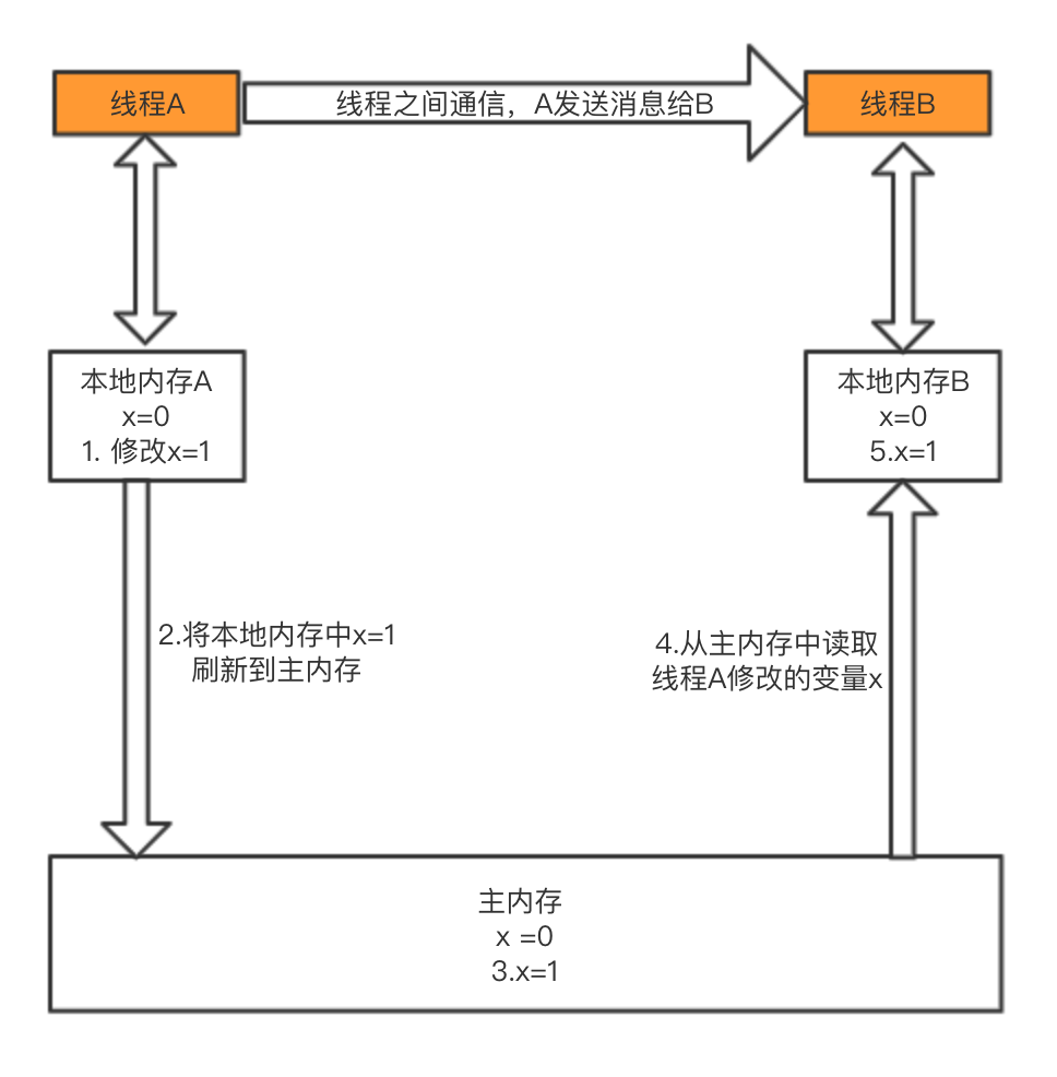 线程之间的通信要通过主内存来进行,每个线程的本地内存保存了一份共享变量的副本,那么线程之间的通信过程如下: